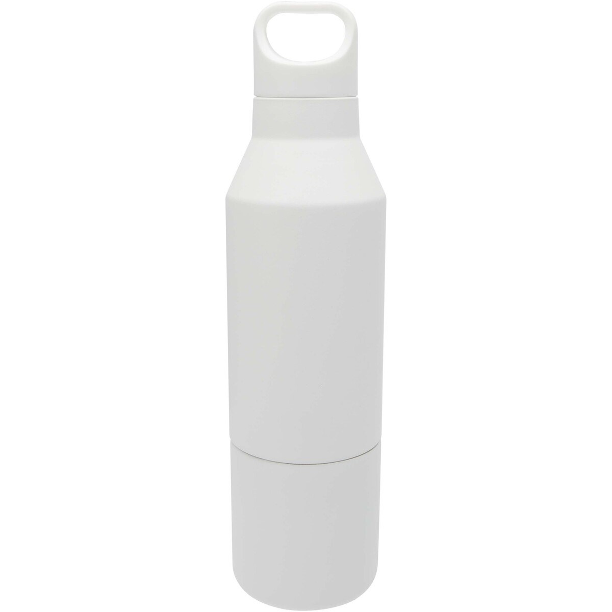 RCS certified stainless steel double wall copper insulated bottle with a removable cup. This multi-use bottle is designed to fit in the side pocket of a backpack, and has a convenient carrying handle that is integrated with the cap. Durable power coating on the outside. Keeps drinks hot for 12 hours or cold for 24 hours. Presented in a recycled cardboard gift box. Volume capacity bottle: 600 ml. Volume capacity cup: 300 ml.